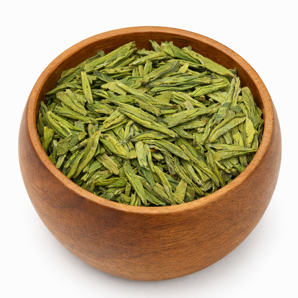 An iconic Longjing (Dragon Well) Green Tea with flat-pressed leaves—brewing a light jade liquor with chestnut aroma, soft sweetness, and a clean, calming finish. A smooth and soothing daily cup.